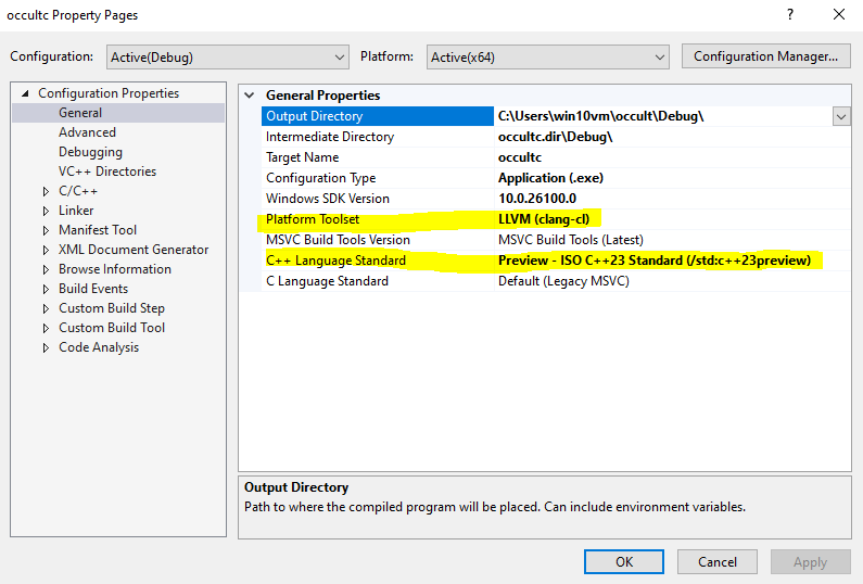 Once you're in the properties menu, you click Platform Toolset and change it to LLVM(clang-cl) and change the C++ language standard to C++23, and click apply.